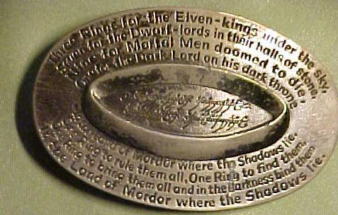 The round Gandalf belt buckle on the left is made by the John E. McCann Buckle Co. of Wenham, MA. And I need the Bilbo and Frodo versions to go with Gandalf. These buckles are made of pewter as a lot of these buckles are.